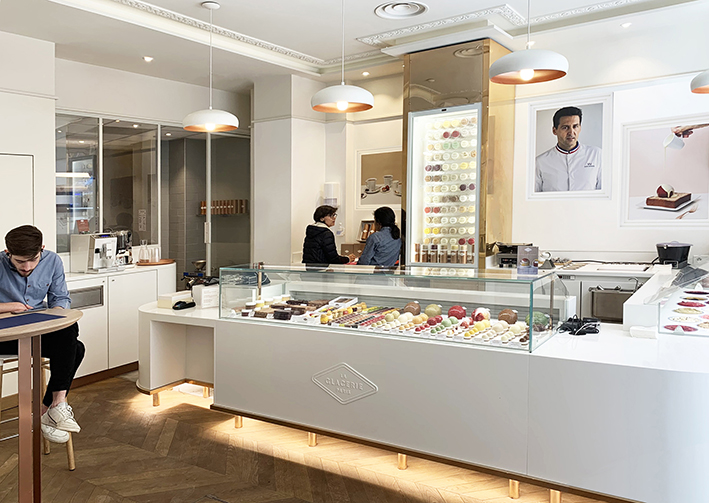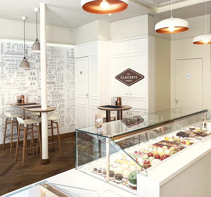 Le lieu d’expression de David Wesmaël, artisan glacier, meilleur ouvrier de France, situé derrière de BHV (Paris).Adaptation et application du concept pour ce 1er site prometteur.